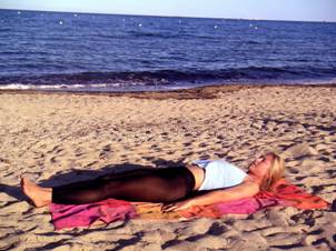 B Placer ensuite les mains contre les cuisses. Les bras sont aussi relaxés que les jambes. Chercher le point « zéro » où l'équilibre est parfait et où tout effort a disparu.