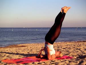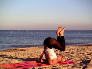 Les débutants pourront se contenter de réaliser la position ci-dessus Ardha Sarvangâsana. Ils pourront par la suite redresser les jambes et parvenir ainsi sans trop de peine à la position yogique finale représentée ici.